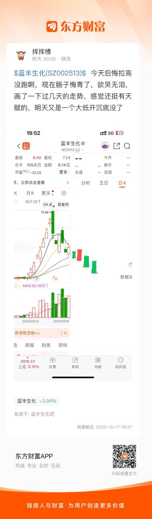 $蓝丰生化(SZ002513)$ 今天后悔拉高没跑啊,现在肠子悔青了,欲哭无泪,画了一下过几天的走势,感觉还挺有天赋的,明天又是一个大低开沉底没了