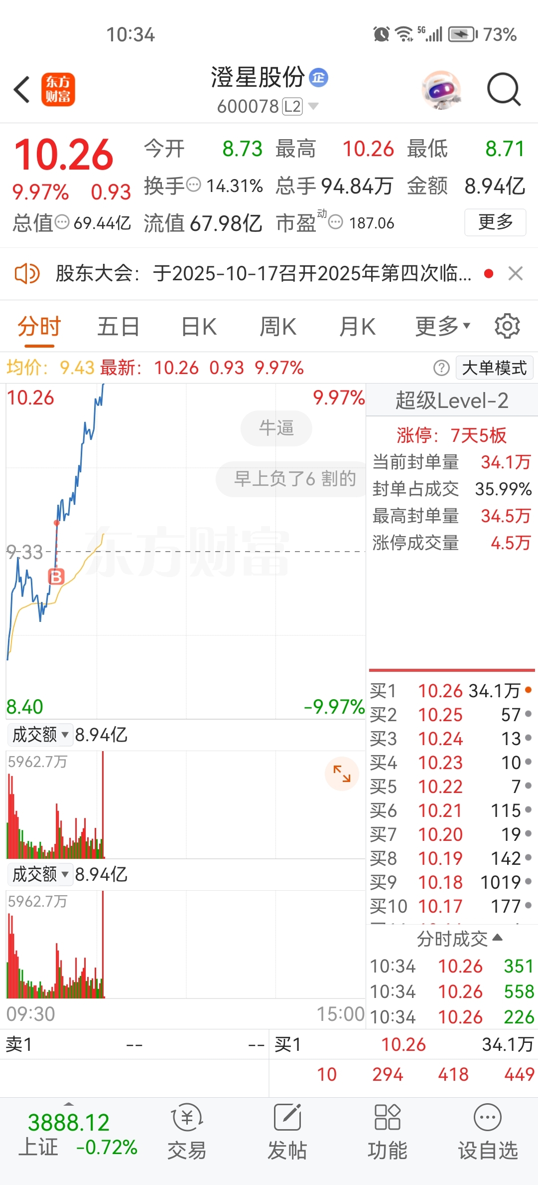 $蓝丰生化(SZ002513)$ 早晨竞价卖了蓝丰,结果少赚了6个点,但是不贪,落袋为安才是真的,主力的意图也不是我们这些小散能揣摩的$澄星股份(SH600078)$ 然后买入澄星喜提8个点,周一继续竞价就卖,还是那句话落袋为安才是真,不贪!该进进,该卖卖,玩超短线每天确保能有几个的盈利,或者少亏足以,周一或者周二看情况能否进场大众公用看情况