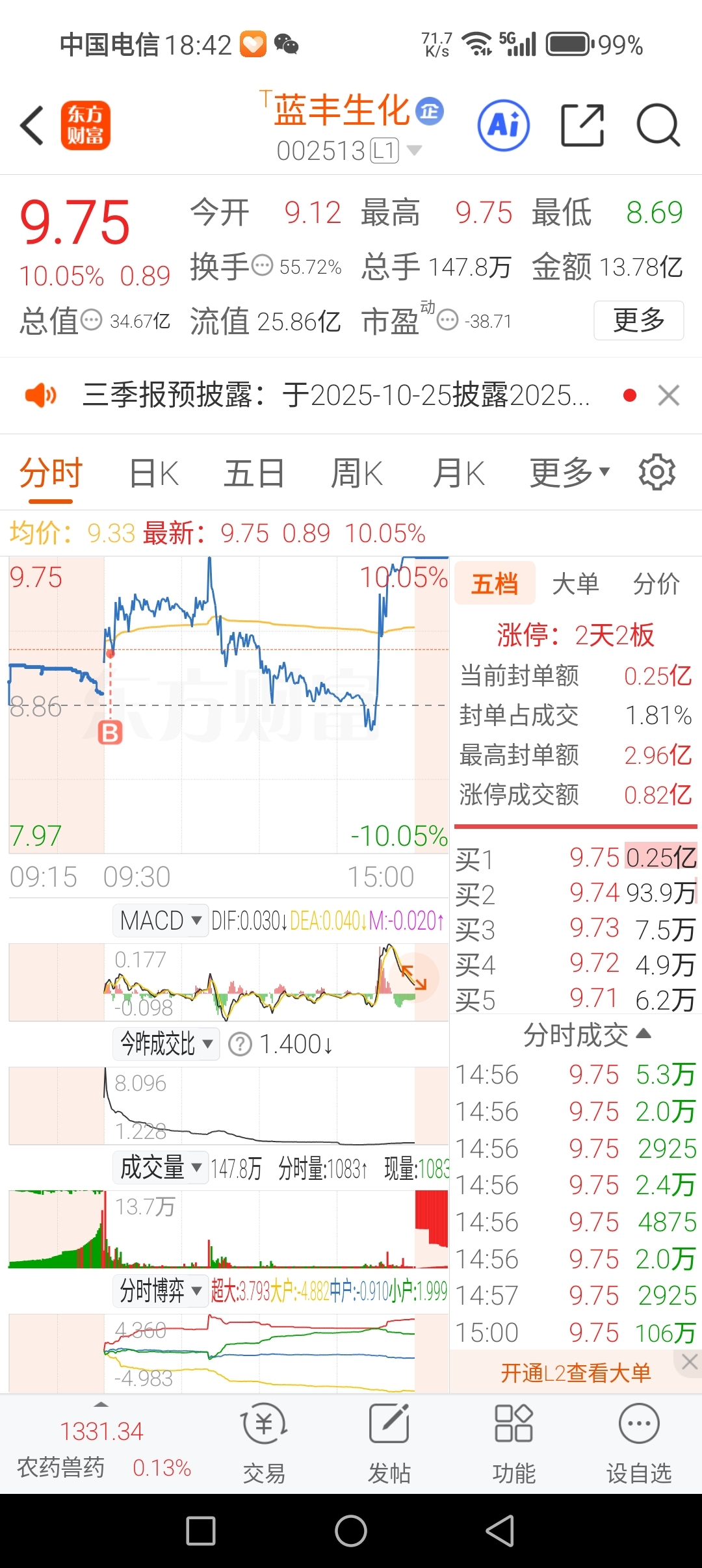 $蓝丰生化(SZ002513)$ 今天进早了,依然抓涨停!