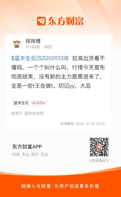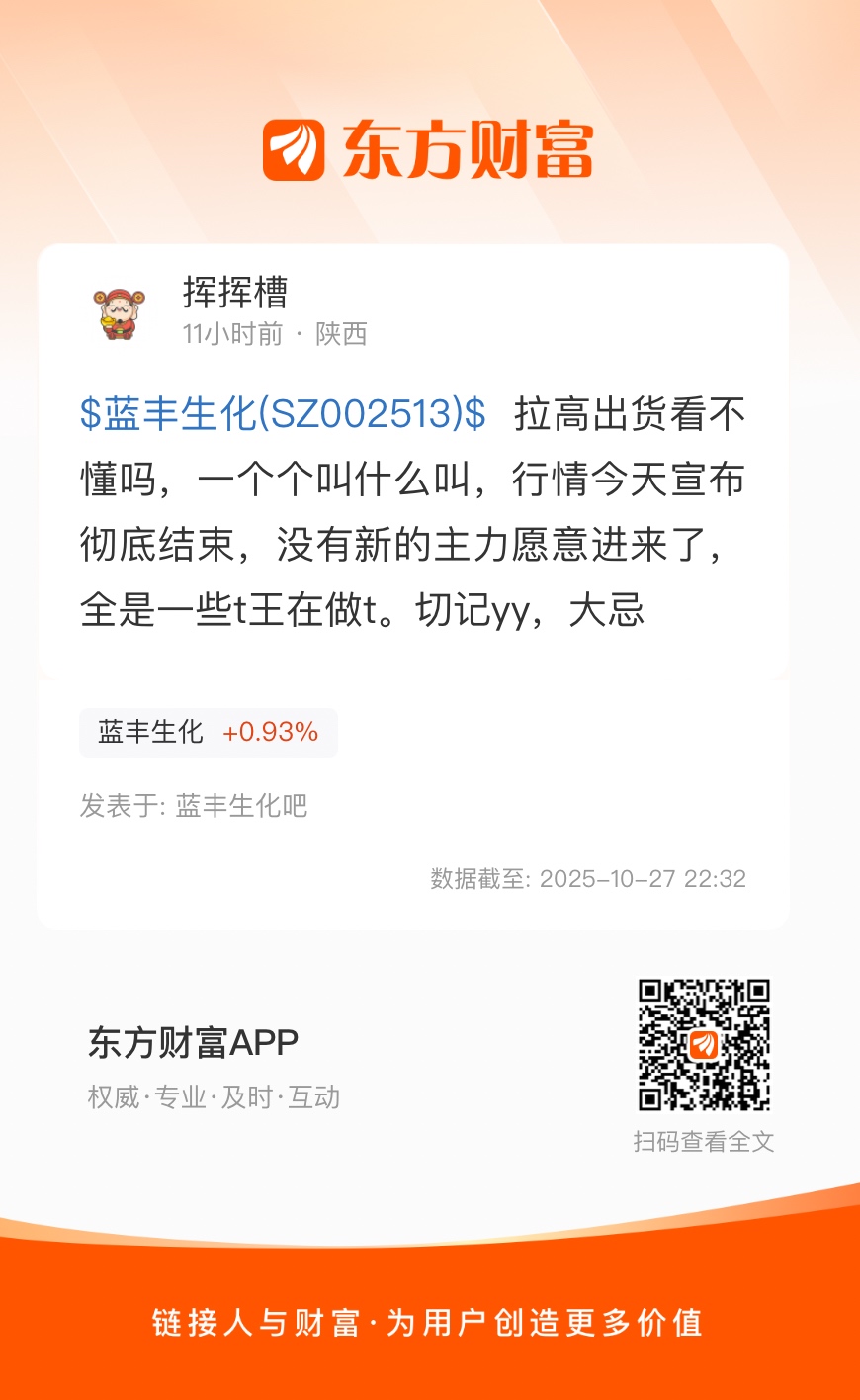 $蓝丰生化(SZ002513)$ 拉高出货看不懂吗,一个个叫什么叫,行情今天宣布彻底结束,没有新的主力愿意进来了,全是一些t王在做t。切记yy,大忌