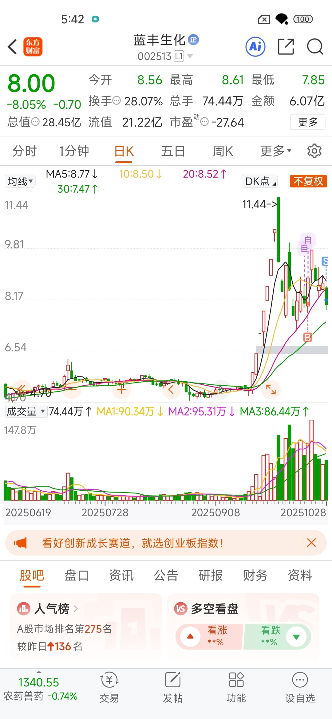 $蓝丰生化(SZ002513)$ 虽然没亏,但也没赚多少,耻辱卖出,学到知识了