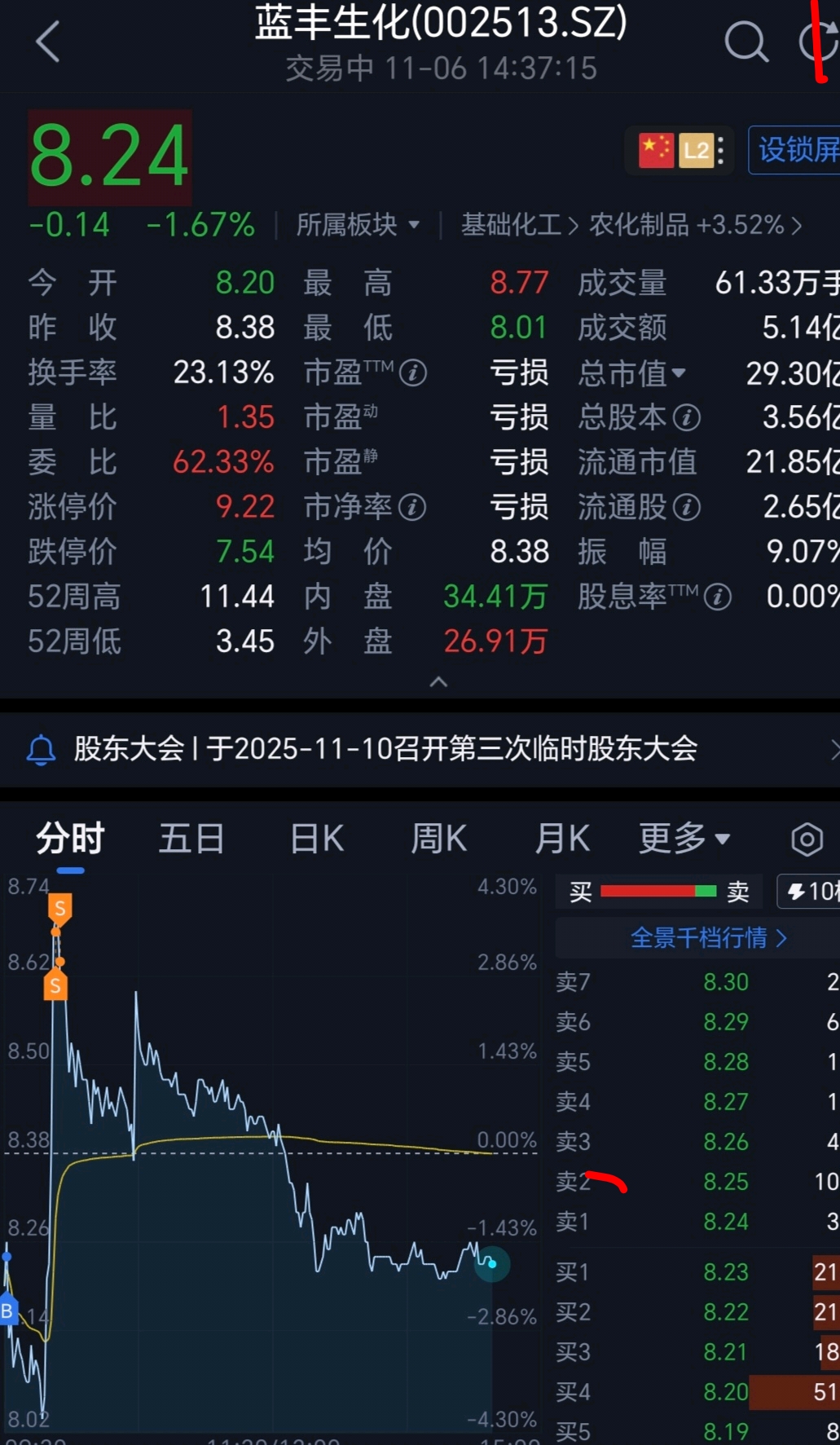 $蓝丰生化(SZ002513)$ 这个票玩起来很累,没时间看盘的不建议买这个。9.49入手,2次做t才把本做到8,低开是常有的事。