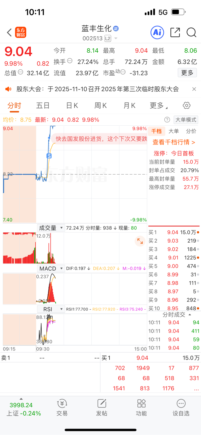 $蓝丰生化(SZ002513)$ 又卖飞了,主力拉的还是不够坚决啊