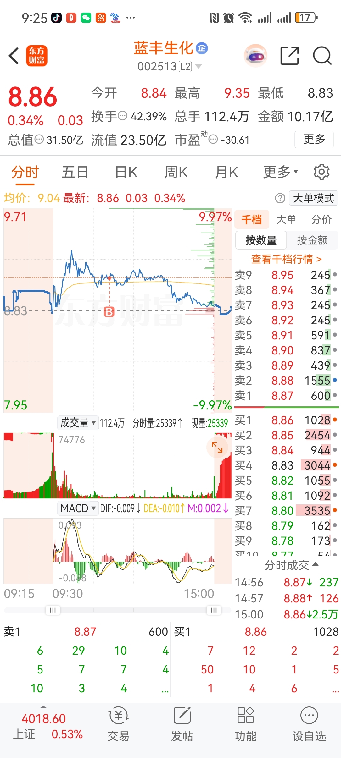 $蓝丰生化(SZ002513)$ 追高进的的,今天就亏了3个点,明天看这龙虎榜明天又要吃面了