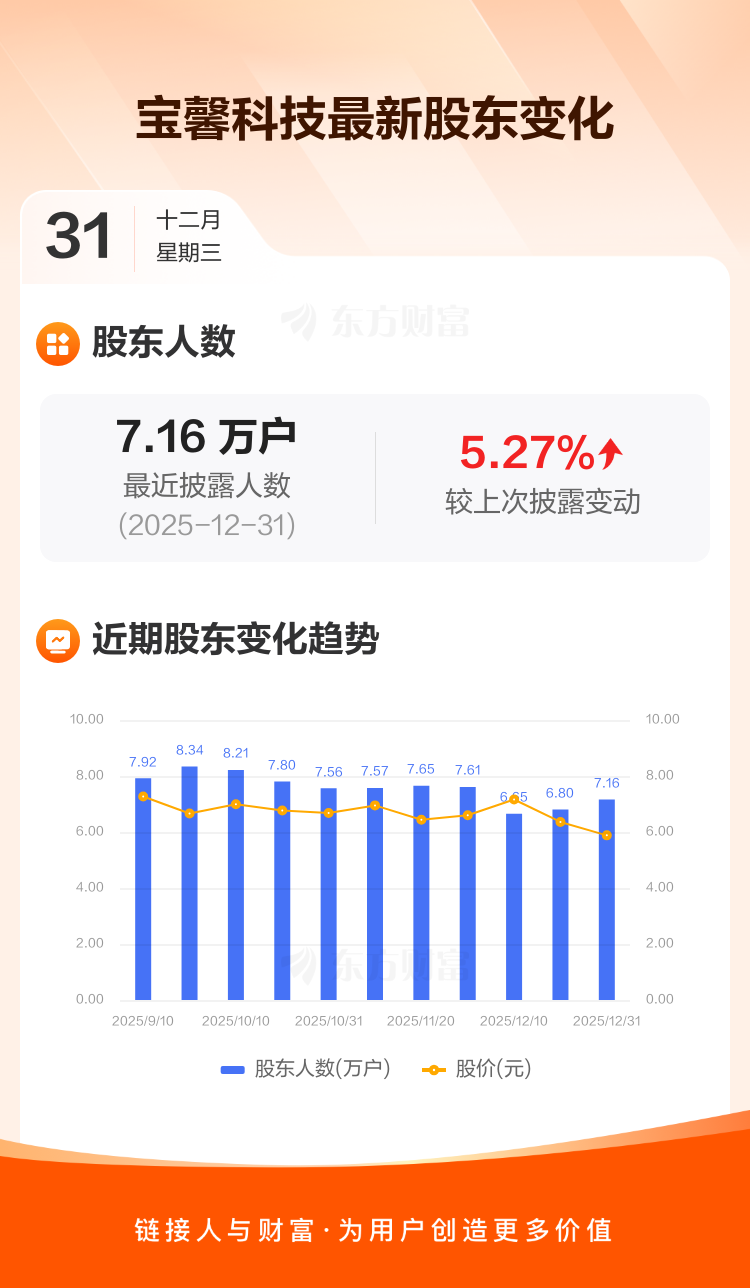 宝馨科技最新披露数据显示,截至12月31日公司股东户数为7.16万户,较上期(2025年12月19日)增加3585户,增幅为5.27%。户均持有流通股数量由上期的8143股下降至7735股,户均持股金额由上期的5.18万元减少至4.55万元。