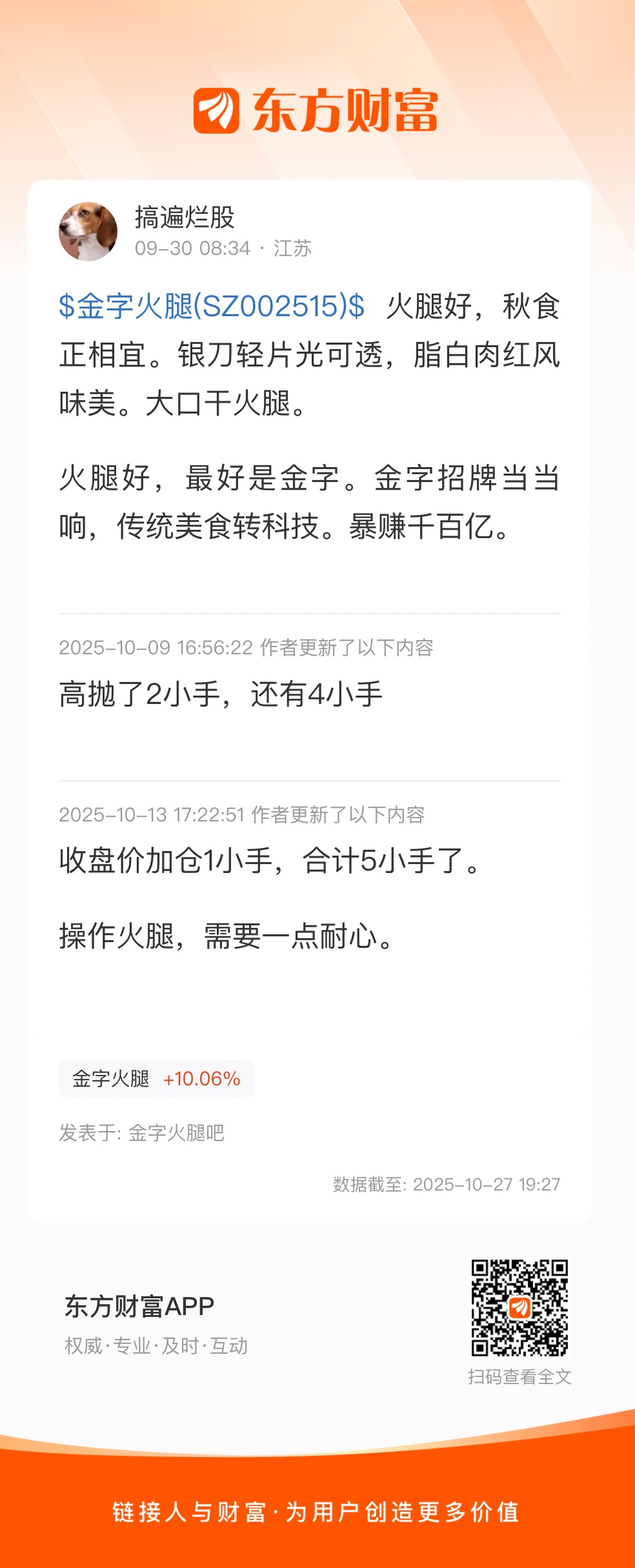$金字火腿(SZ002515)$ 火腿好,秋食正相宜。银刀轻片光可透,脂白肉红风味美。大口干火腿。