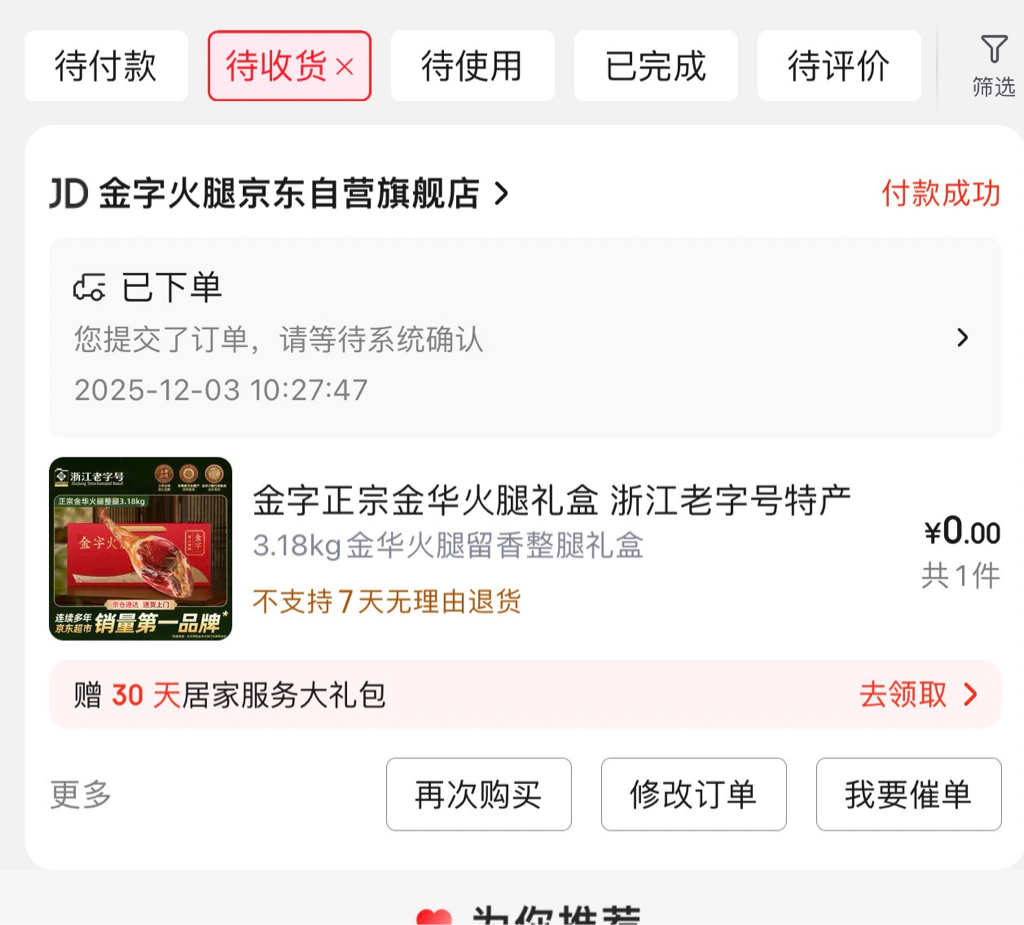 已下两单,一单送礼,一单自己吃!感谢主力!