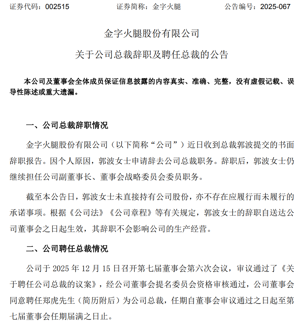 12月15日晚间,“火腿第一股”金字火腿(002515)公告,因个人原因,郭波申请辞去公司总裁职务。辞职后,郭波仍继续担任公司副董事长、董事会战略委员会委员职务。公司于2025年12月15日召开第七届董事会第六次会议,审议通过了《关于聘任公司总裁的议案》,经公司董事会提名委员会资格审核通过,公司董事会同意聘任郑虎为公司总裁。