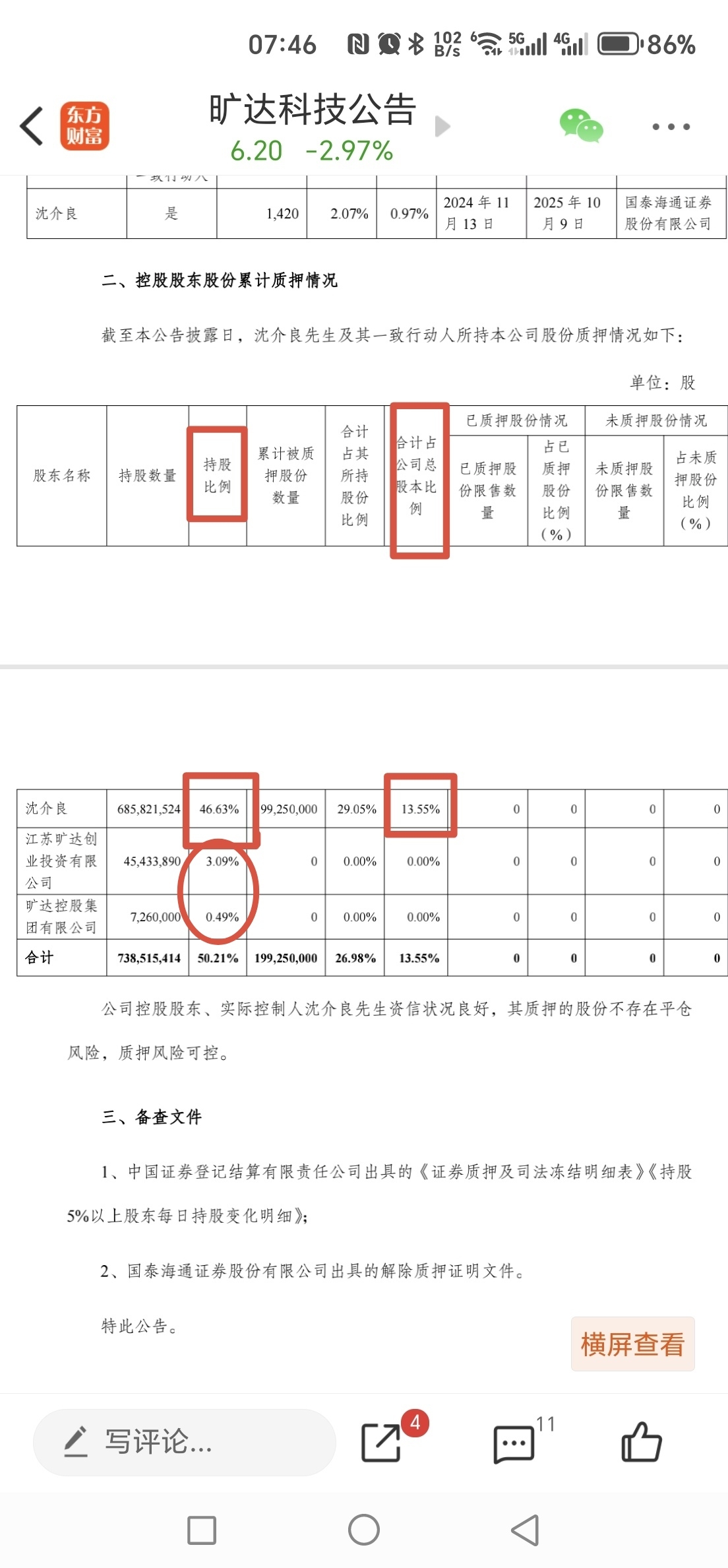 沈介良还需发布一次公告,从其它地方解除质押1.34%