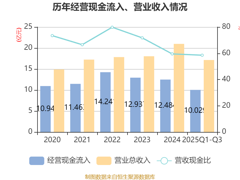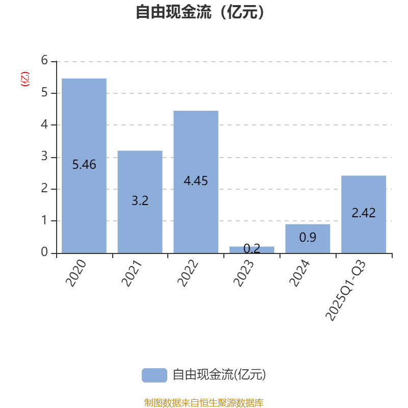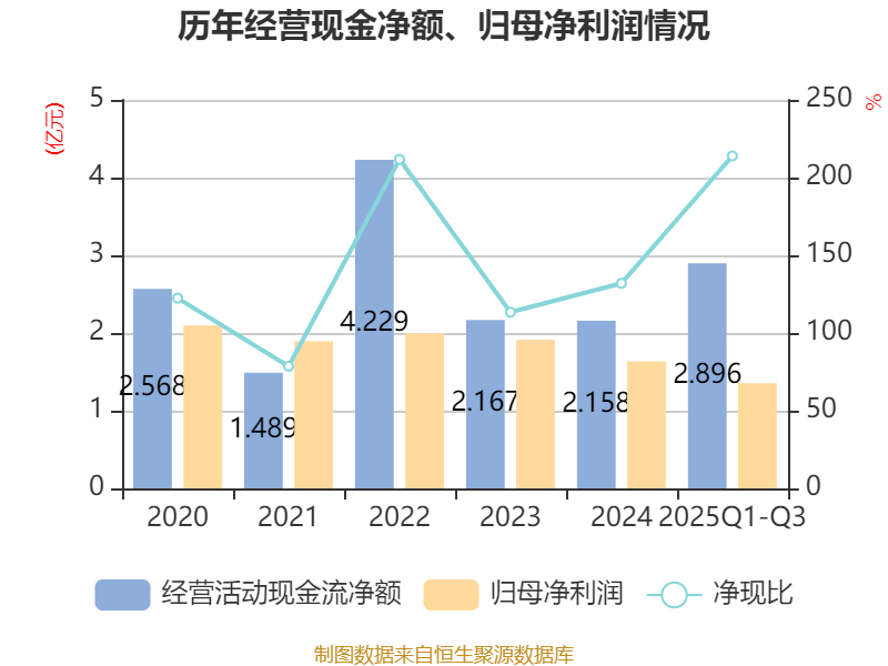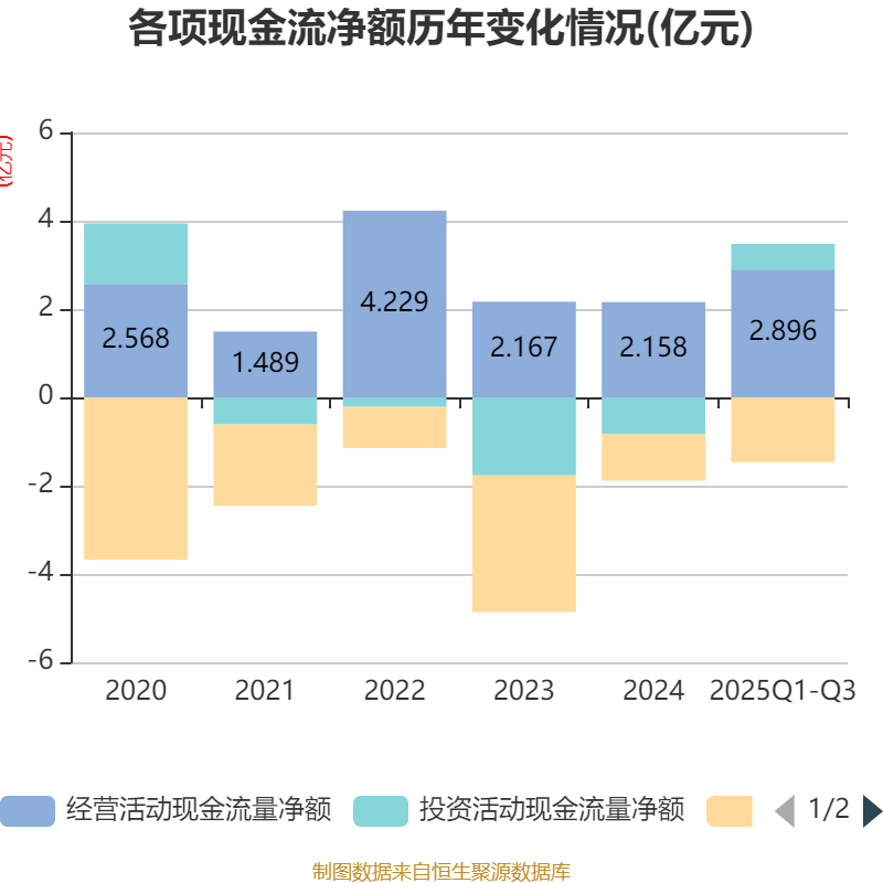 2025年前三季度,公司经营活动现金流净额为2.9亿元,同比增长268.36%;筹资活动现金流净额-1.47亿元,同比减少4539.16万元;投资活动现金流净额5792.73万元,上年同期为-327.32万元。