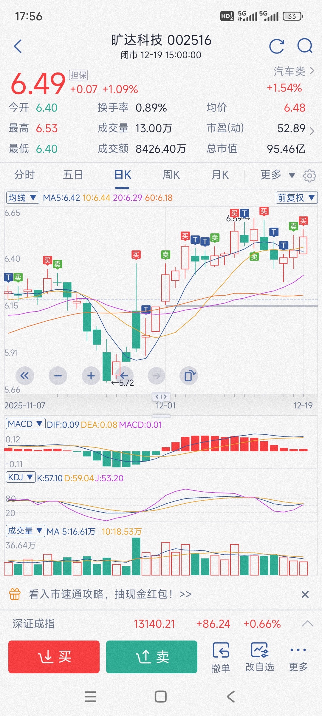 $旷达科技(SZ002516)$ 要是看好就得跟我一样,卖出后敢于追高买回来!而不是盼望它跌下去再来买!!!星期四开盘6.38清了,星期五尾盘6.48买回