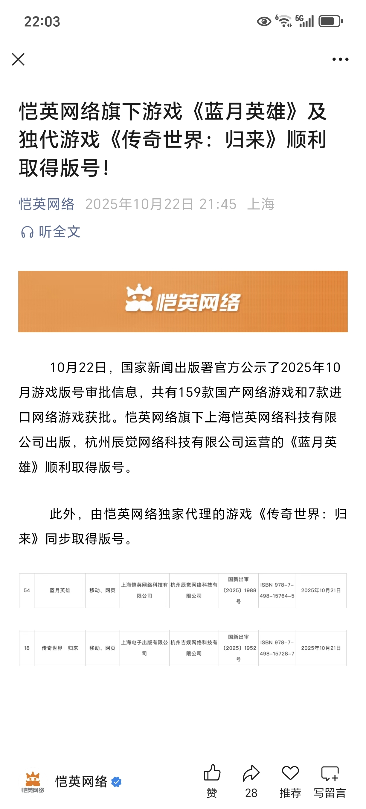 $恺英网络(SZ002517)$ 恺英网络两个产品取得版号