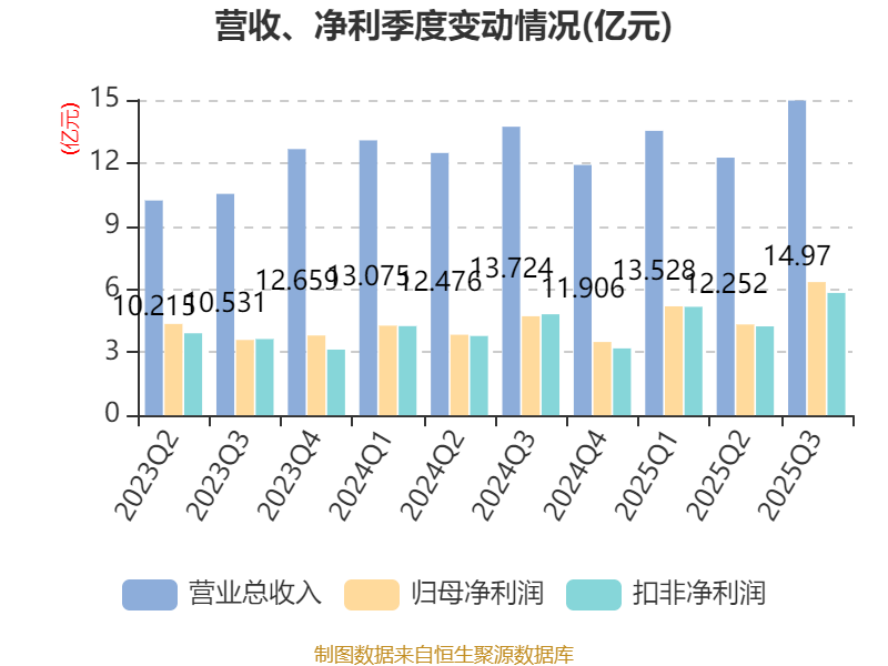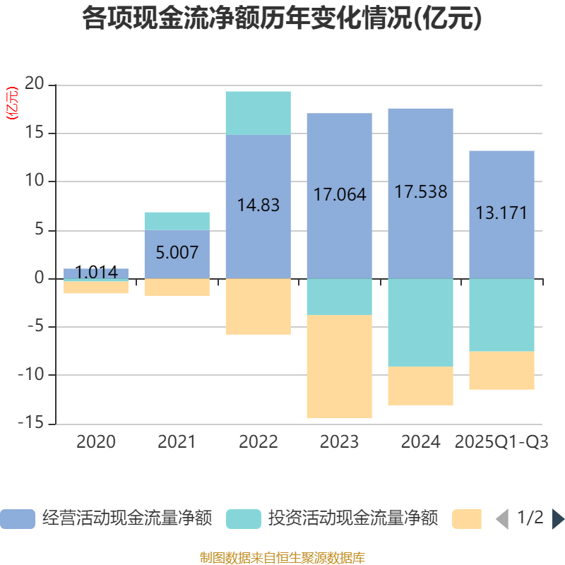 2025年前三季度,公司经营活动现金流净额为13.17亿元,同比增长6.84%;筹资活动现金流净额-3.94亿元,同比减少958.03万元;投资活动现金流净额-7.54亿元,上年同期为-6.69亿元。