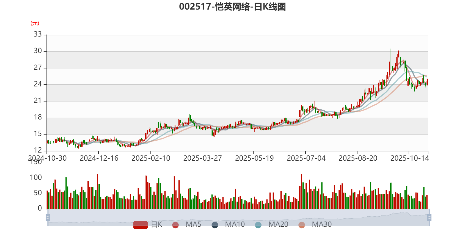 中证智能财讯恺英网络(002517)10月30日披露2025年第三季度报告。前三季度公司实现营业总收入40.75亿元,同比增长3.75%;归母净利润15.83亿元,同比增长23.70%;扣非净利润15.2亿元,同比增长18.65%;经营活动产生的现金流量净额为13.17亿元,同比增长6.84%;报告期内,恺英网络基本每股收益为0.74元,加权平均净资产收益率为20.78%。
