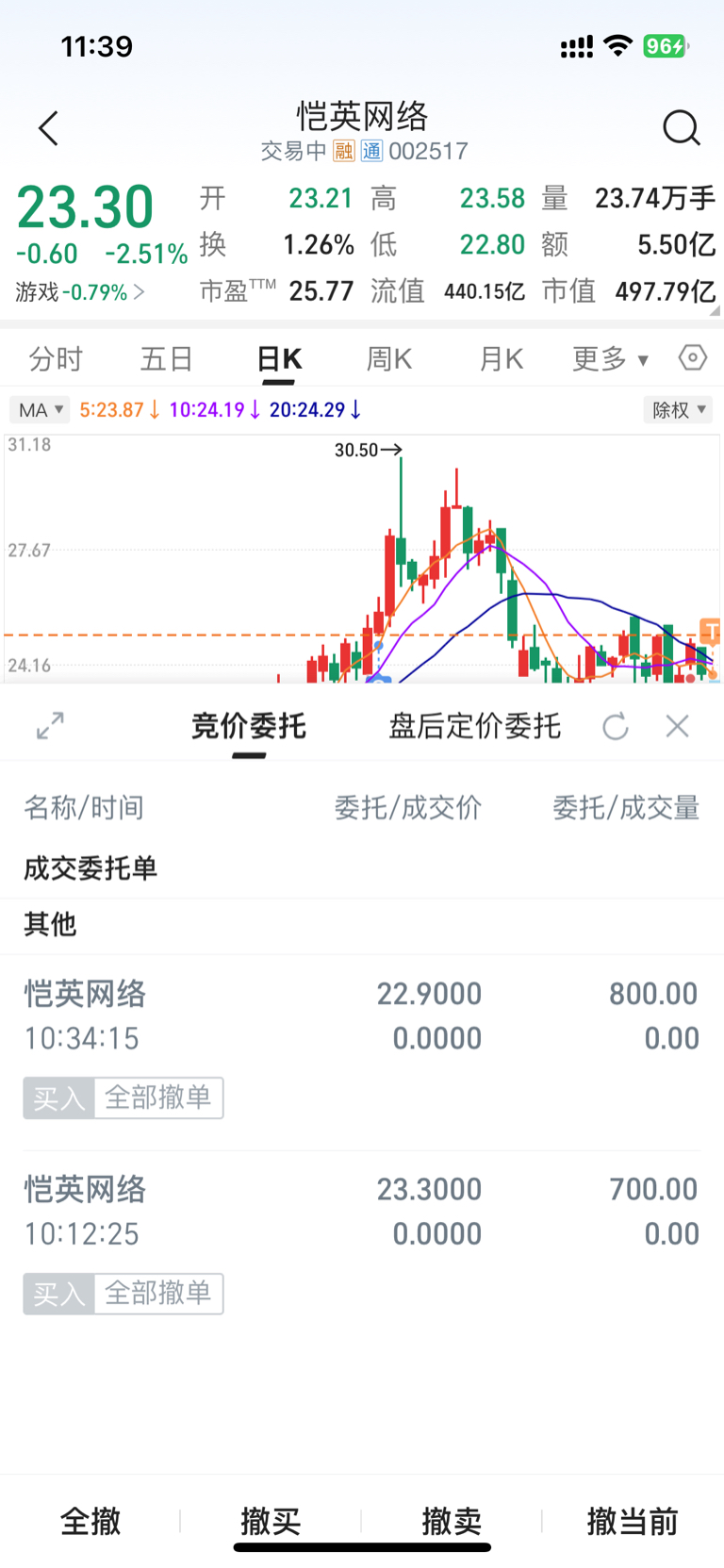 $恺英网络(SZ002517)$ 可惜我22.9撤单了,后面忙去了,错过了
