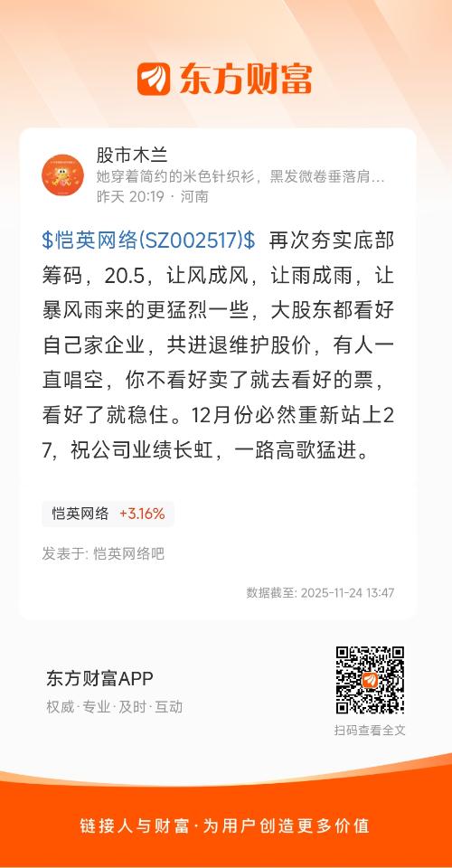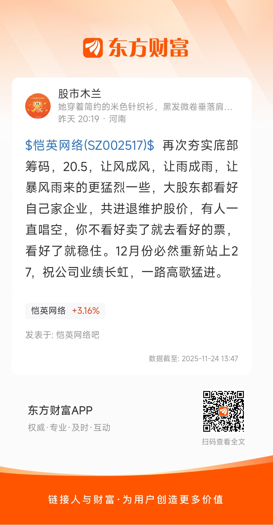 $恺英网络(SZ002517)$ 再次夯实底部筹码,20.5,让风成风,让雨成雨,让暴风雨来的更猛烈一些,大股东都看好自己家企业,共进退维护股价,有人一直唱空,你不看好卖了就去看好的票,看好了就稳住。12月份必然重新站上27,祝公司业绩长虹,一路高歌猛进。