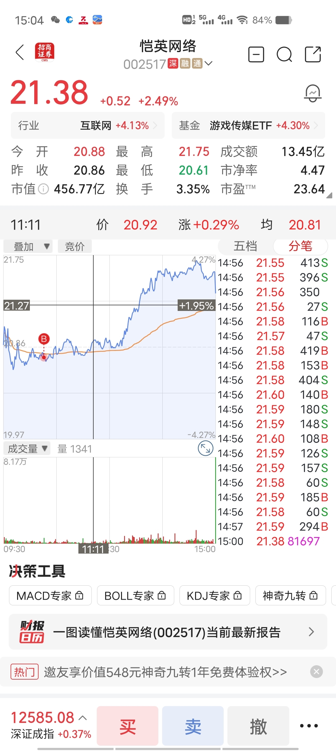 $恺英网络(SZ002517)$ 哪个蛋,尾盘搞事!早知道21.58T掉算了!
