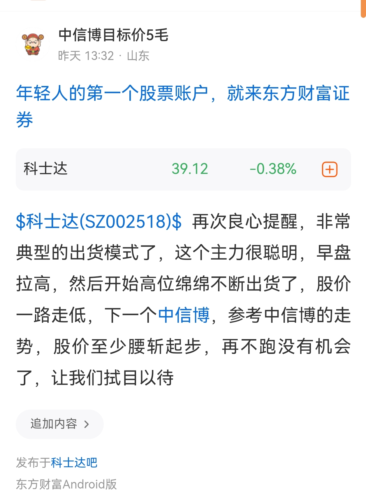 温馨提示: 1.根据《证券法》规定,禁止编造、传播虚假信息或者误导性信息,扰乱证券市场;2.用户在本社区发表的所有资料、言论等仅代表个人观点,与本网站立场无关,不对您构成任何投资建议。用户应基于自己的独立判断,自行决定证券投资并承担相应风险。《东方财富社区管理规定》