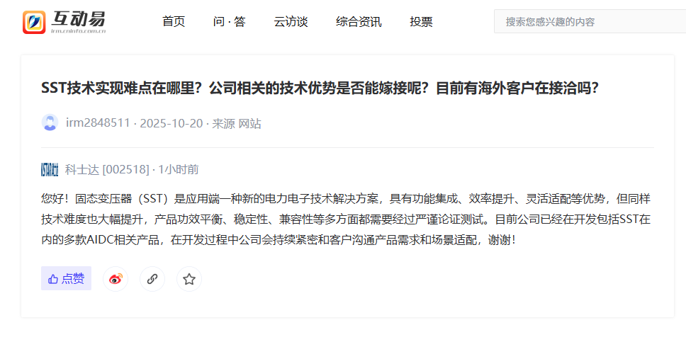 科士达:目前已在开发包括固态变压器在内的多款AIDC相关产品