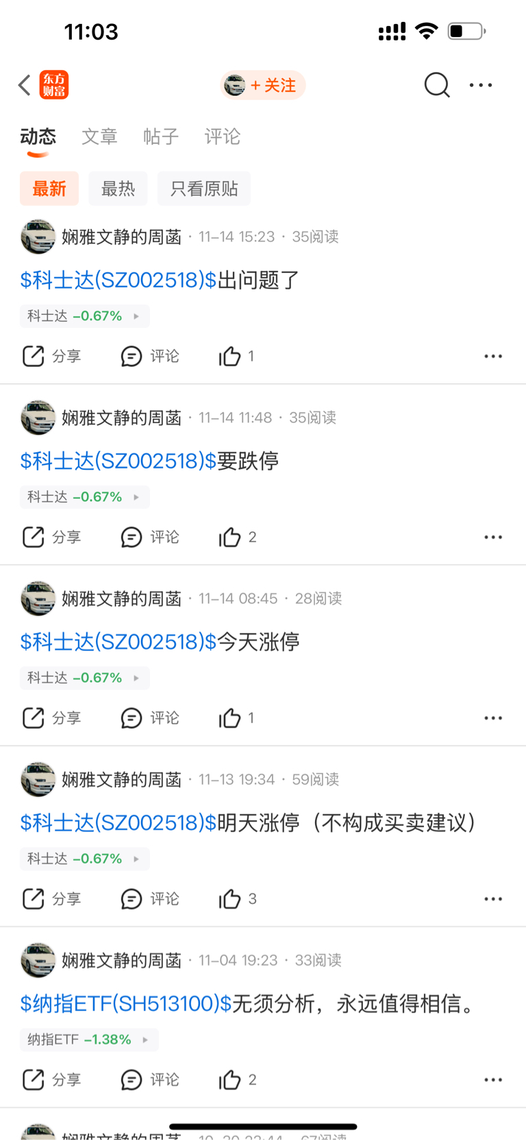 $科士达(SZ002518)$ 11月13号买入,14号早上信心满满涨停,结果开盘一路下跌7个点,中午开始喊跌停,收盘后就开始说胡话了,然后就天天来股吧坚持打卡
