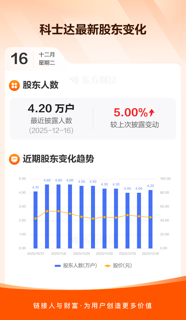 科士达最新披露数据显示,截至12月16日公司股东户数为4.20万户,较上期(2025年12月11日)增加2000户,增幅为5.00%。户均持有流通股数量由上期的1.41万股下降至1.35万股,户均持股金额由上期的65.20万元减少至60.21万元。