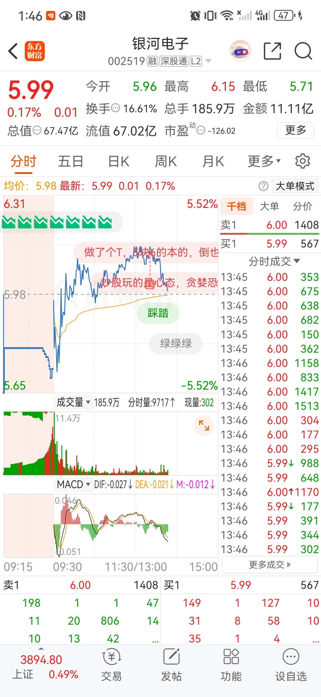 $银河电子(SZ002519)$ 对不起大家。又被我买崩了。已经无数次买了就跌。卖了就涨。昨天卖了雷科,国风,今天都大涨