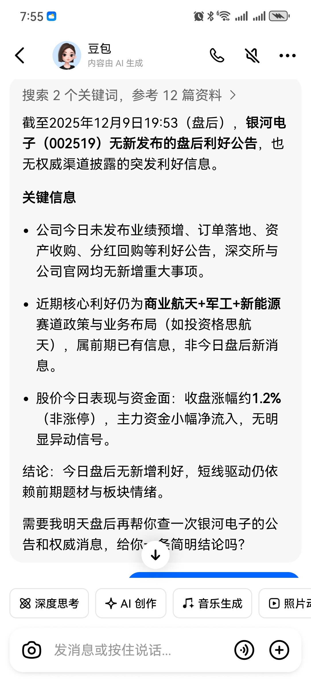 什么神仙,豆包告诉我今天银河电子会红1.2收盘????现在才早上8点,就能知道晚