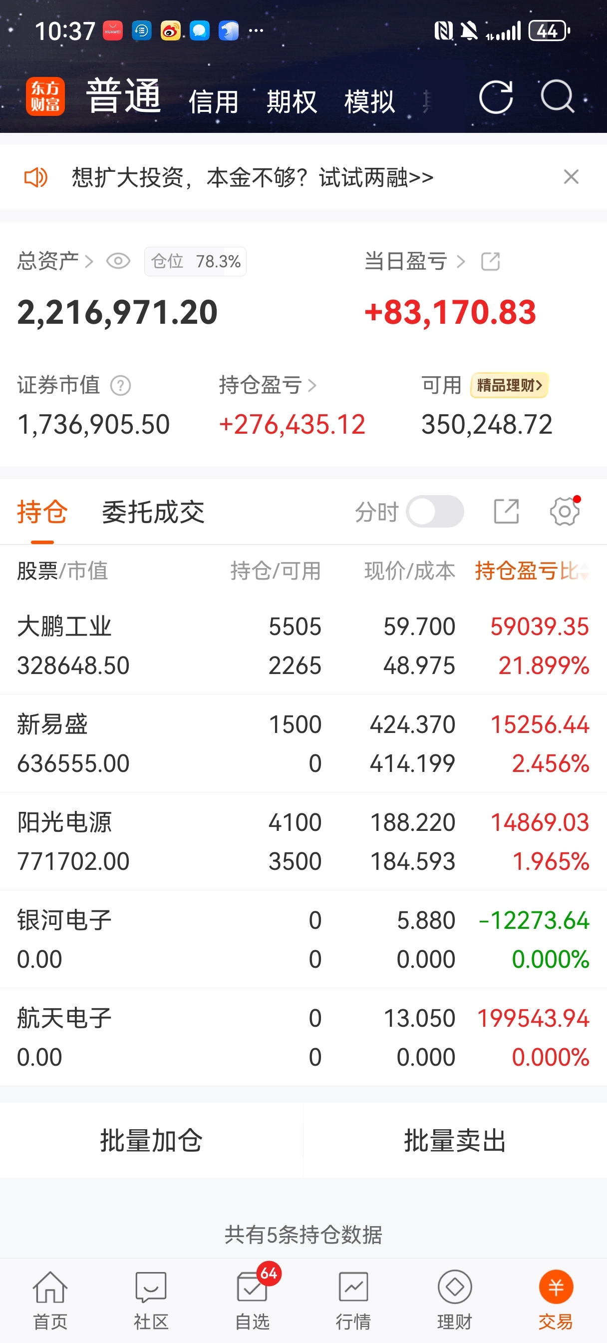 $银河电子(SZ002519)$ 真的没想到啊,银河电子竟然会拉涨停,开盘拉高绿的直接被我割肉了,少赚不少,航天电子早上拉红卖,本来设置12.98买回30万,到了12.99自己又给撤单了,本来可以做3个多点的t,阳光电源拉高没卖,大鹏工业比较可惜的是早上竞价结束,设置了开盘价低0.5个买,开盘价竟然就是最低价,错失大肉,不然今天这个t完美