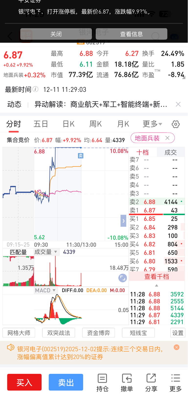 $银河电子(SZ002519)$ 设置好封单不足15万,自动卖出,落单为安,看明天盘面要不要再进,这个票适合叼一口就走