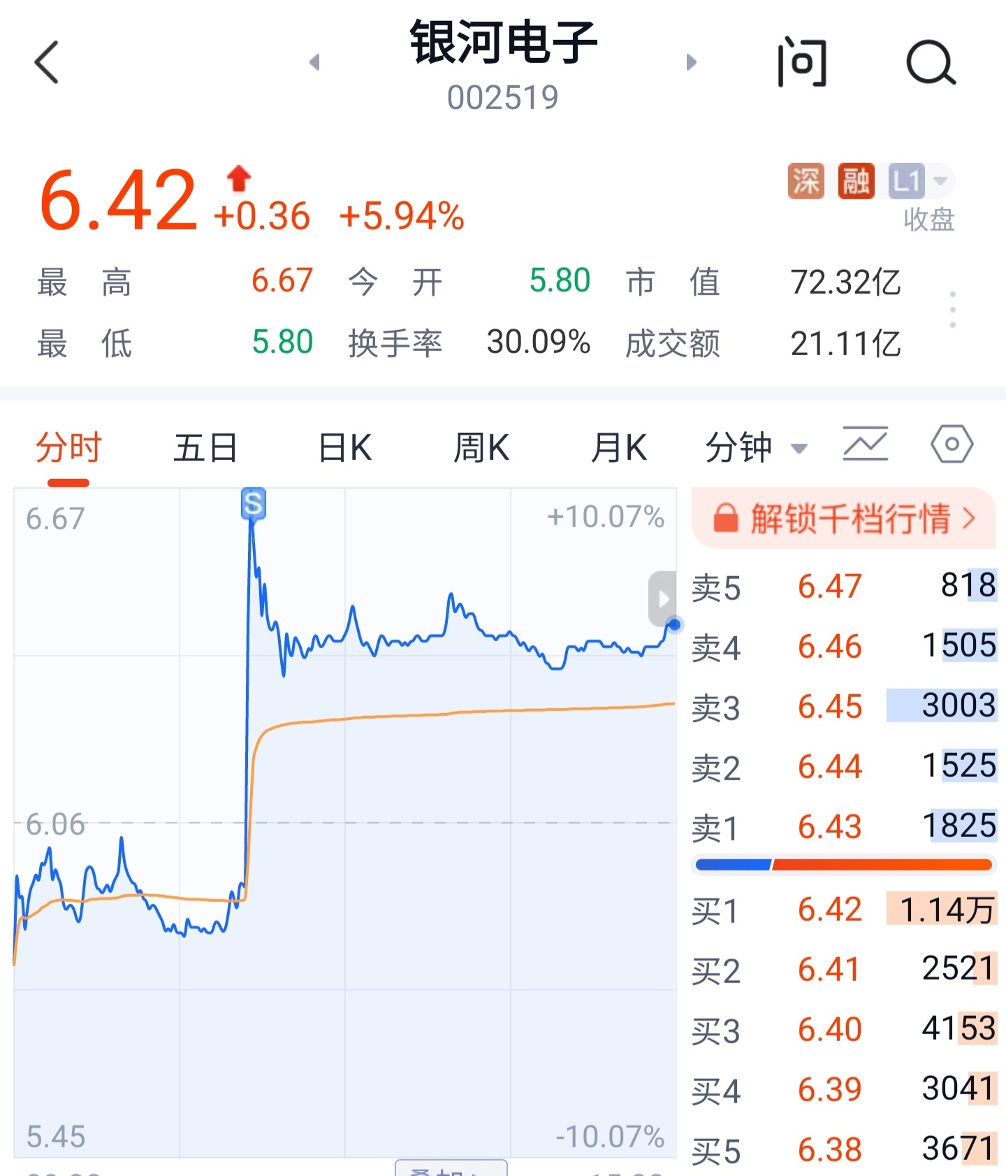 $银河电子(SZ002519)$ 跟了朱莉熬一周,吃了三个板。今天接近11点半板封不住时,我果断止盈离场——主要是这朱莉有“涨后必砸”的习惯,可以参考前天,打板不到一分钟,一E多封单说撤就撤。不过后续看,这票大概率还有一波上涨行情。