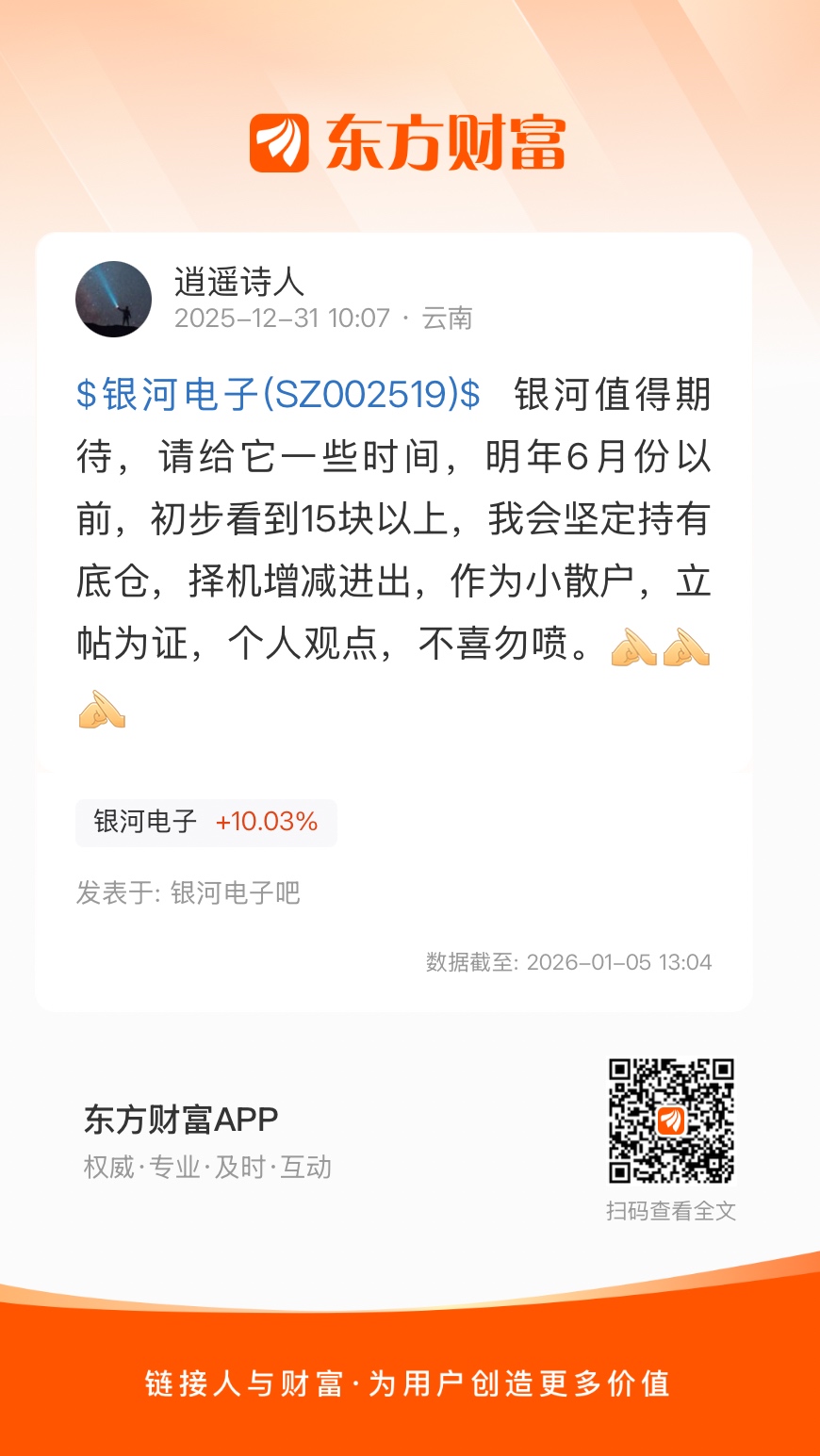 $银河电子(SZ002519)$ 银河值得期待,请给它一些时间,明年6月份以前,初步看到15块以上,我会坚定持有底仓,择机增减进出,作为小散户,立帖为证,个人观点,不喜勿喷。