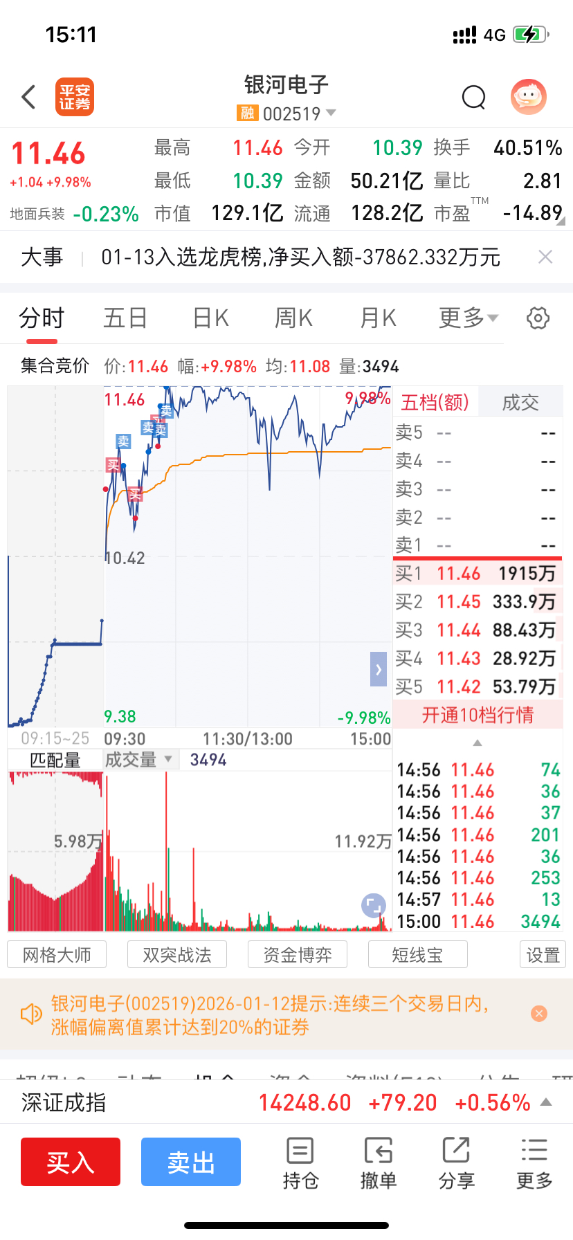 $银河电子(SZ002519)$ 符合预期,明天市场回流,高举高打。无异动压制,顶部还早。