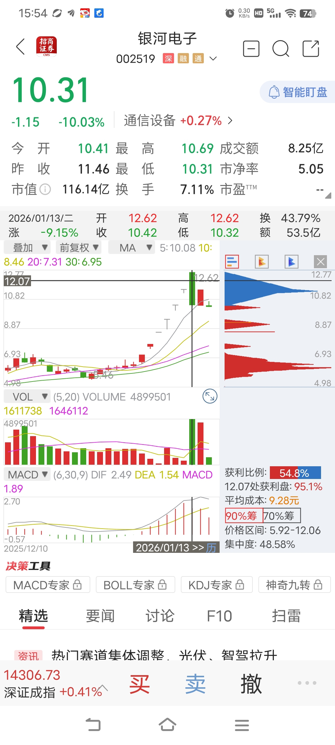 $银河电子(SZ002519)$ 对比一下周二和周四的筹码峰,周二的主力筹码还在下方没走完,周三下方的筹码就差不多都到上面了,下方的现在基本上就是长线筹码,短线筹码已经派发完毕,加上商业航天已经退潮,后面就是一地鸡毛了。