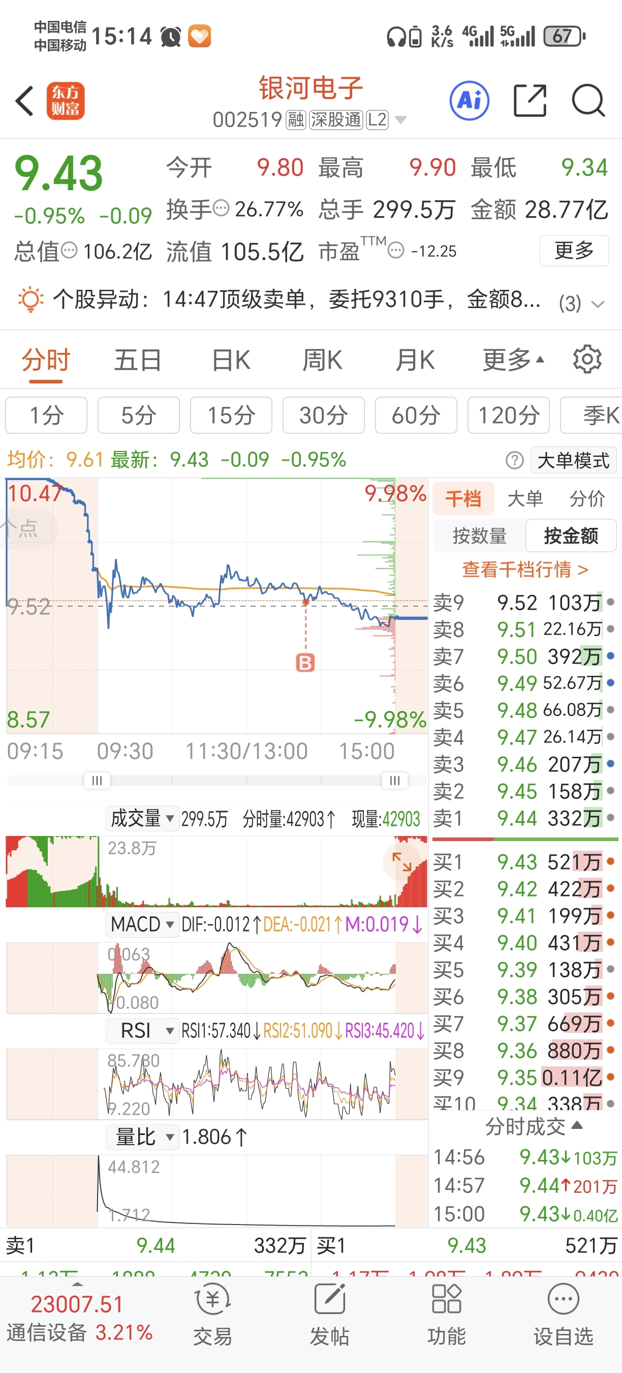 他早上的时候不应该开这么高,也不算太高呀,结果这样砸下来,会把2点半之后拉上去还好,结果这样砸盘越砸越低,那就看明天了嘛,反正我是五八买的,不行的话就跑嘛,那也没办法呀
