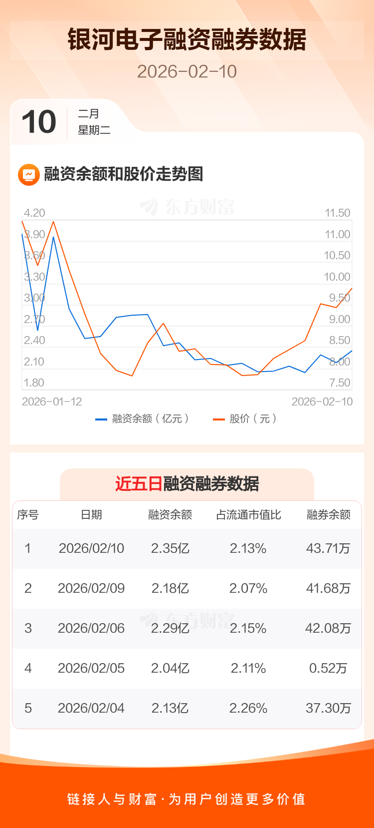 交易所最新数据显示,银河电子于2026年2月10日获融资买入1.07亿元,融资偿还8993.67万元,当日融资净买入1715.92万元。目前,该股融资余额2.35亿,占流通市值比例为2.13%。