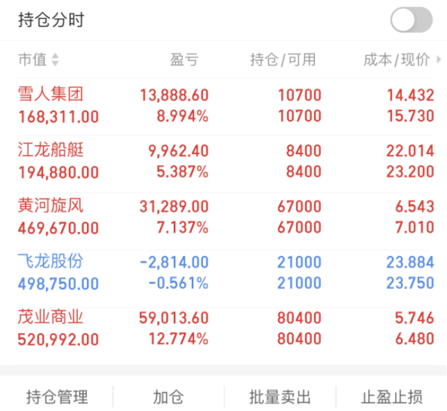 茂业商业,主力底部拉升均线的时候建仓的,当时盘中贸易和商业板块特别强,有打板预期,总的来看,资金流入。所以短期还是看多,溢价高就走。目前还在均线以上运行,核心资产和开新仓信号可在小绿绿看红尘8,说明支撑力还是有的,不过压力位置阻力会比较大,所以需要谨慎看待。短线还是偏强一些,可以适当的延长持有。不过回调就减仓。