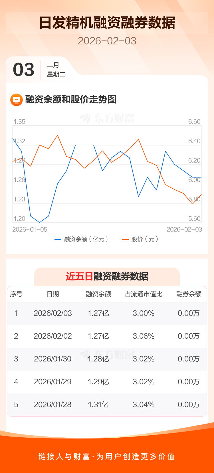 交易所最新数据显示,日发精机于2026年2月3日获融资买入358.81万元,融资偿还385.82万元,当日融资净偿还27.01万元。目前,该股融资余额1.27亿,占流通市值比例为3.00%。