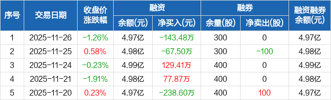 齐峰新材:融资净偿还143.48万元,融资余额4.97亿元(11-26)