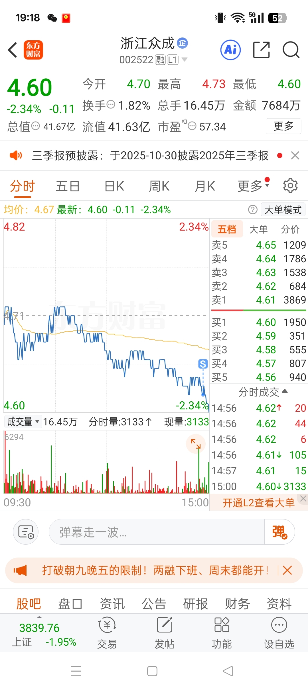$浙江众成(SZ002522)$ 实在扛不住了,今天,止损一半,亏了12个点无语