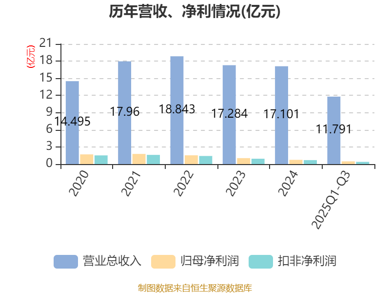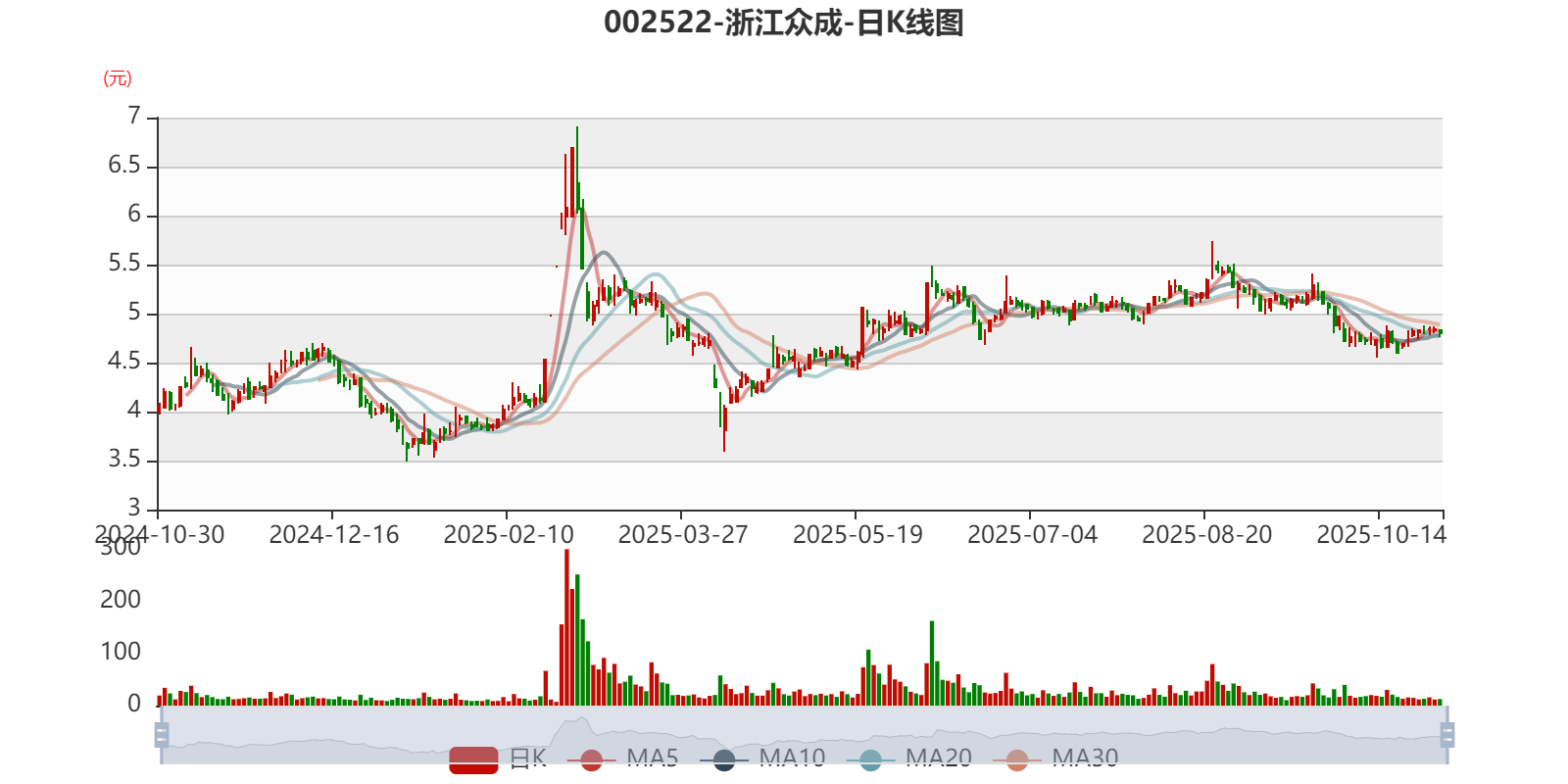 中证智能财讯浙江众成(002522)10月30日披露2025年第三季度报告。前三季度公司实现营业总收入11.79亿元,同比下降5.43%;归母净利润4769.21万元,同比增长6.96%;扣非净利润3834.01万元,同比下降0.76%;经营活动产生的现金流量净额为6879.25万元,同比下降56.46%;报告期内,浙江众成基本每股收益为0.05元,加权平均净资产收益率为2.08%。