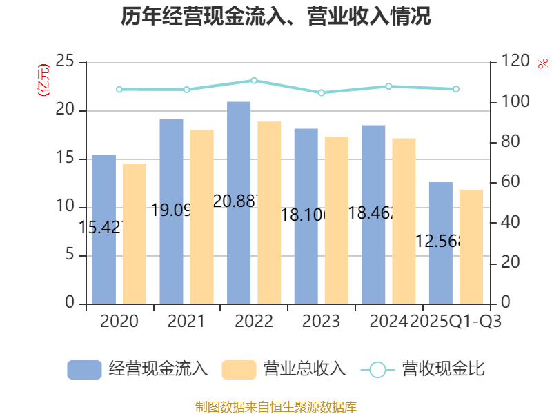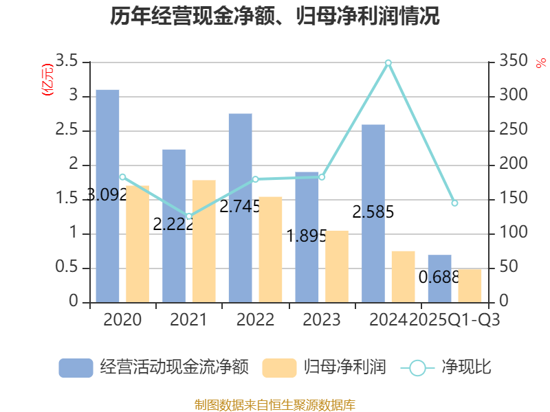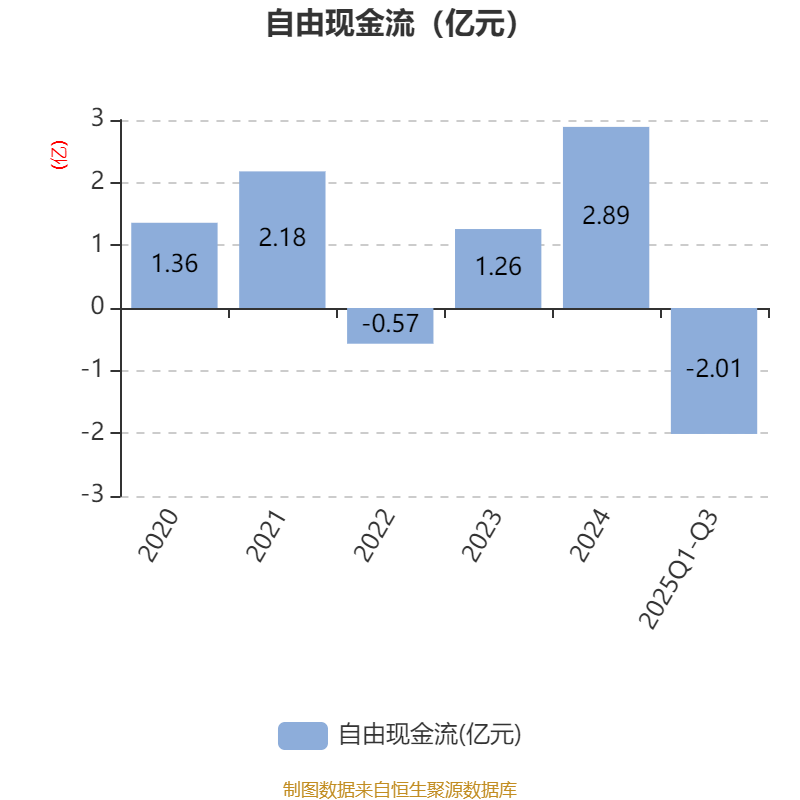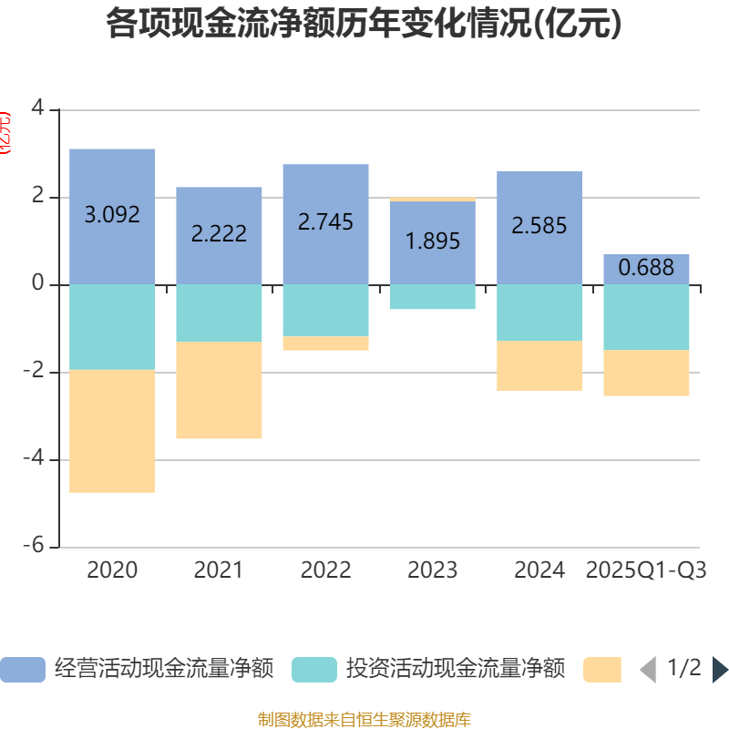 2025年前三季度,公司经营活动现金流净额为6879.25万元,同比下降56.46%;筹资活动现金流净额-1.05亿元,同比增加1.13亿元;投资活动现金流净额-1.5亿元,上年同期为-2075.05万元。