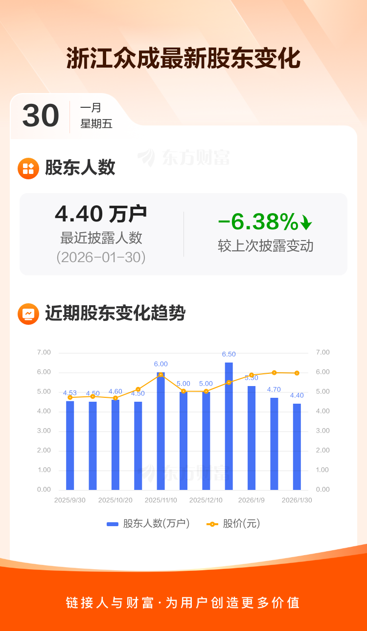 浙江众成最新披露数据显示,截至1月30日公司股东户数为4.40万户,较上期(2026年1月20日)减少3000户,降幅为6.38%。户均持有流通股数量由上期的1.93万股上升至2.06万股,户均持股金额由上期的11.51万元增加至12.26万元。