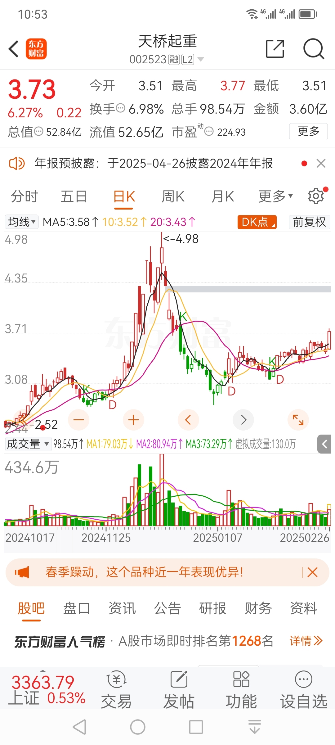 $天桥起重(SZ002523)$ #复盘记录# 过一个多月的盘整,终于放量突破,再重的压力也可以起飞