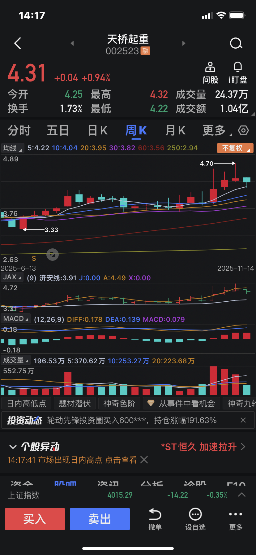 $天桥起重(SZ002523)$ 周K线需要一顶,下周才好搞起来