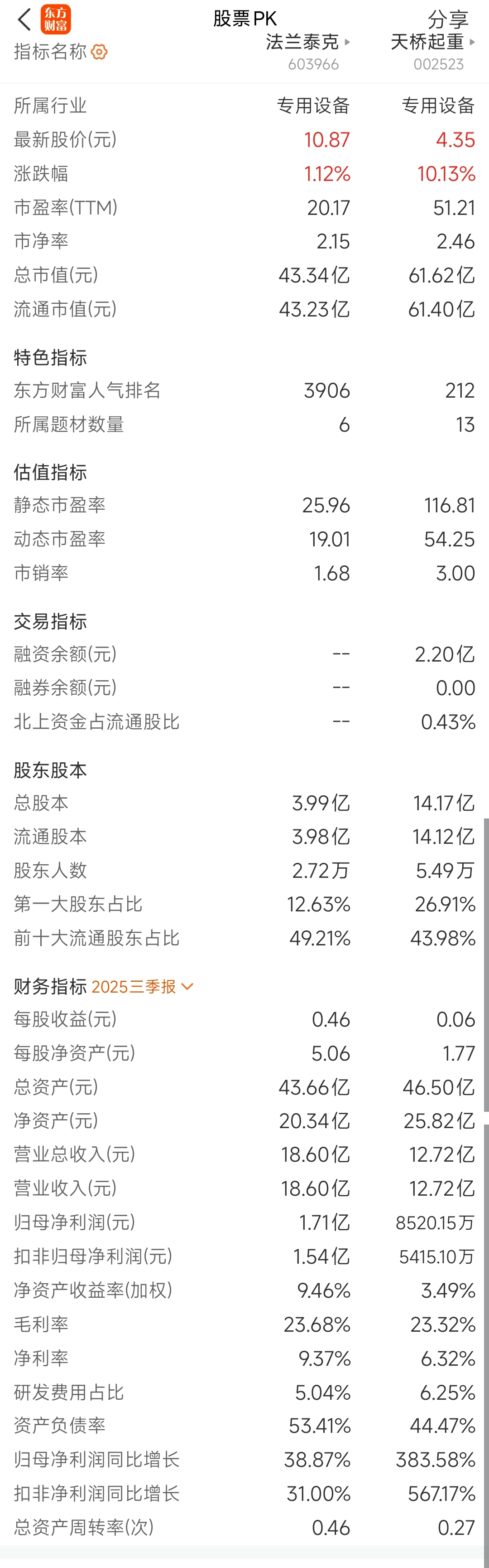 $天桥起重(SZ002523)$ 法兰泰克对比天桥起重各种指标很很明显秒杀这货。
