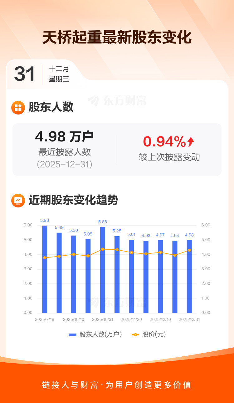 天桥起重:截至12月31日最新股东户数4.98万户,较上期增加0.94%