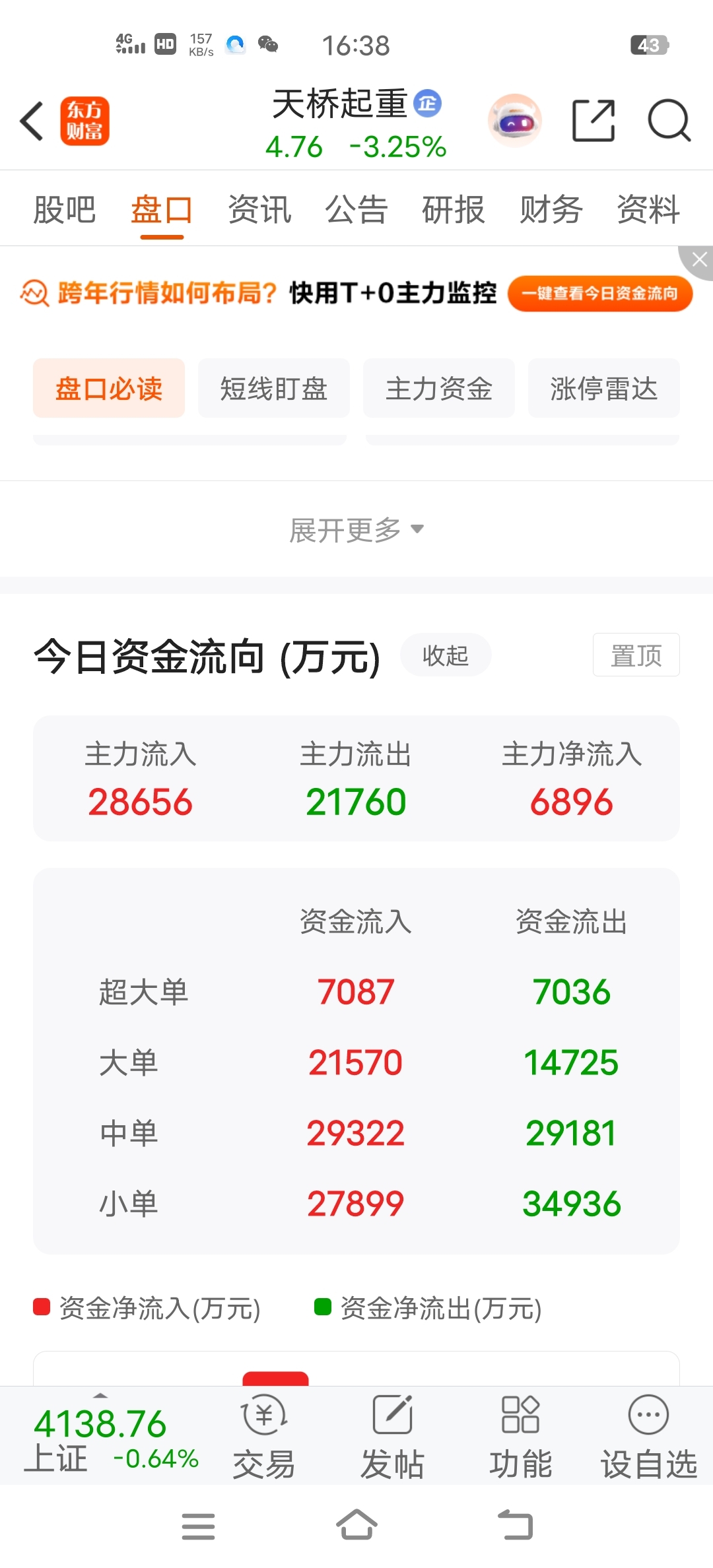 $天桥起重(SZ002523)$ 昨天有机构买入,今天换手13,成交额8.9亿,净流入6千多万,不过主力净流出,1千多万,奇怪的很今天的净流入,明天开盘看看是到顶了,还是换庄了,,压力位上升到5.02了,原来的4.26不跌破现在也应该上升到4.38附近了,是马是是熊,明天见分晓