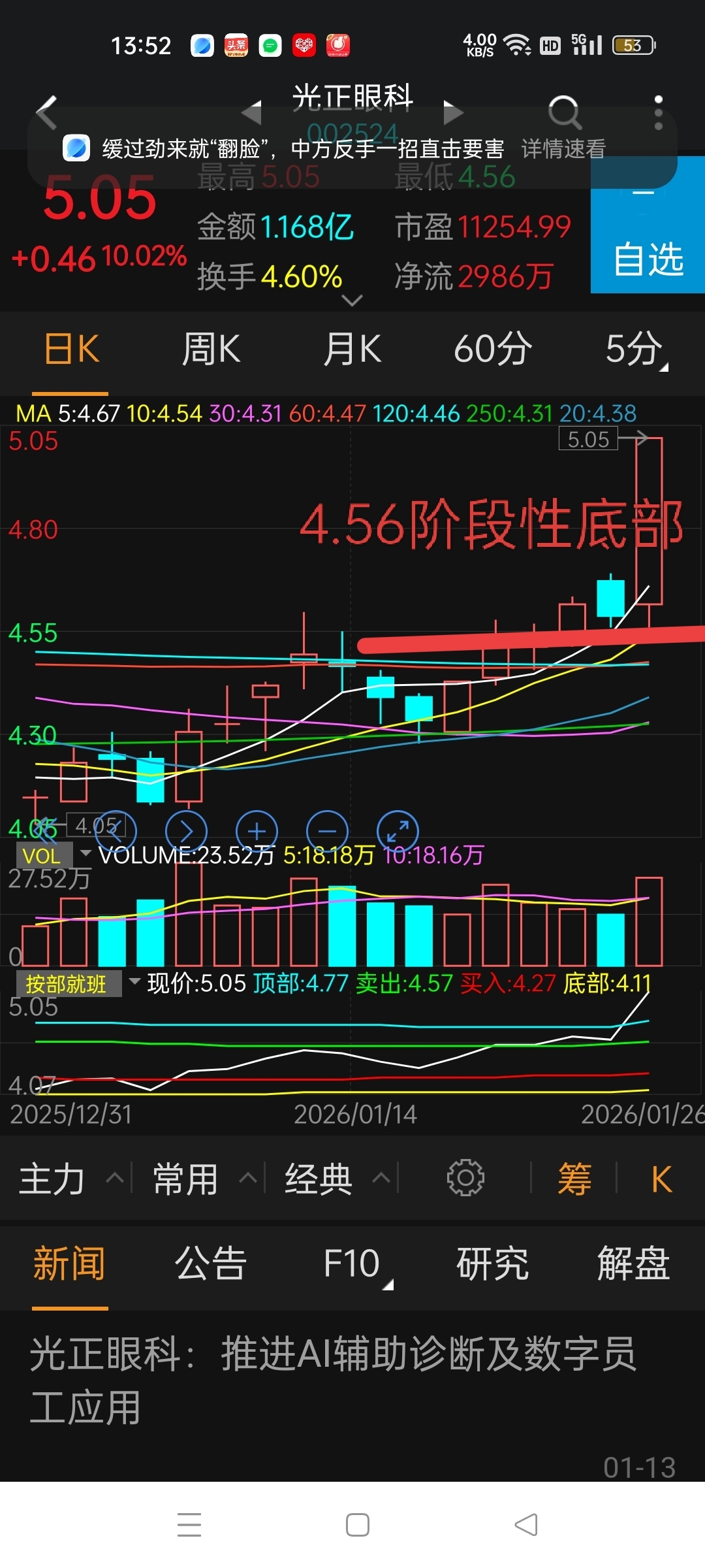 $光正眼科(SZ002524)$ 4.56平底一路上行