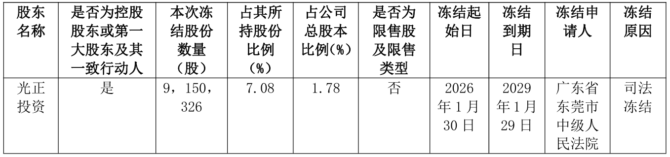 2月6日晚间,光正眼科(002524)发布公告,公司控股股东光正投资915万股被司法冻结,占其所持股份比例为7.08%,占公司总股本比例为1.78%。冻结起始日为2026年1月30日,冻结到期日为2029年1月29日,冻结申请人为广东省东莞市中级人民法院。