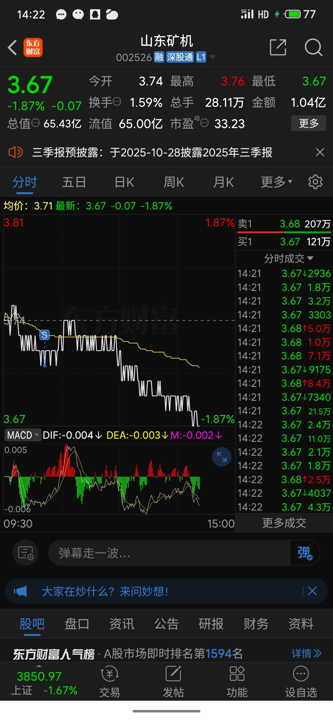 $山东矿机(SZ002526)$ 割肉跑了亏了三千,主力可以拉了!